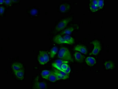 Immunofluorescence staining of MCF-7 cells with CSB-PA021334LA01HU at 1:133, counter-stained with DAPI. The cells were fixed in 4% formaldehyde, permeabilized using 0.2% Triton X-100 and blocked in 10% normal Goat Serum. The cells were then incubated with the antibody overnight at 4°C. The secondary antibody was Alexa Fluor 488-congugated AffiniPure Goat Anti-Rabbit IgG(H+L).